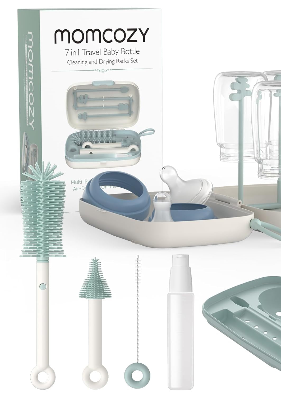 Momcozy Bottle Brush Set - Baby Bottle Cleaner Kit with Silicone Brush, Nipple Brush, Straw Brush, Soap Dispenser, Drying Rack