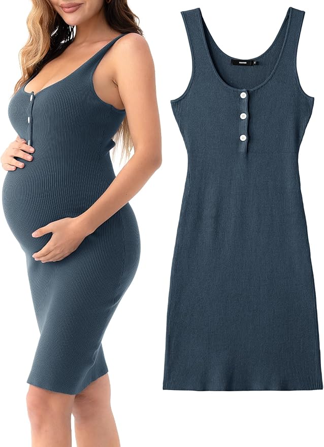 Rnxrbb Striped Button Maternity Dress Summer Bodycon Tank Pregnancy Dresses Sleeveless Clothes Ribbed Knit